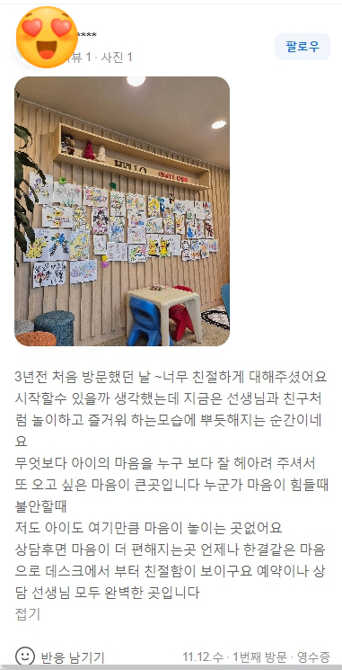 대구수성 헬로스마일 심리상담센터6세남자아이 KPRC, JTCI, PAT 사전검사와 놀이평가 심리상담 받은 후기상담신청서와 함께부모양육태도검사 PAT(부모각각), 기질검사 JTCI, 아동인성검사 KPRC검사지를 미리 작성하고 방문하였어요아이에 대한 여러검사를 통해아이의 기질을 먼저 파악해볼수 있어서 좋았어요! 아동상담부터 청소년상담, 성인상담, 가족상담, 부부상담 등다양한 상담프로그램을 받을 수 있어요,예약제니까 대기 시간없이 바로 상담 진행해서 좋았습니당^^선생님께서 색칠놀이도 꺼내주셔서 제가 상담하는동안 첫째는색칠놀이하면서 기다렸답니다^^ 상담사선생님 인상부터 마음이 편해지는 느낌,,,의자에 앉으니 괜히 울컥해지는 기분이었네요ㅎㅎ편하게 평소 아이키우면서 어려웠던점이나 고민에 대해 물어보셔서아들이 6살이 되면서 느낀 아이의 행동이나 걱정되는 것에 대해 얘기를 나누었어요. 아이혼자 놀이검사가 끝나면 양육자와 함께 놀이검사를 하는데,평소에 아들과 잘 놀아주지 않아서 처음엔 어떻게 놀아줘야할지 모르겠더라구요,,,그러다 아이와 조금씩 얘기하고 노는모습을 상담사 선생님께서 살펴보시고 관찰해주셨어요그렇게 양육자 상담과 놀이검사후 상담사선생님과 깊은 이야기를 나누었습니다.(중략)육아서에서 볼수 없는 현실적인 나의 상황을 얘기하고상담하고 해결방안을 얘기해보는것이너무 좋은 시간이었어요.아이와 고민이 생길때, 아이가 이해하기 힘들때,육아에 지칠때, 아이의 행동과 기질을 이해해보는소중한 시간 가져보시면육아에 많은 도움이 될거같아요!헬로스마일 수성점 너무 추천드려요♥ 대구심리상담센터 수성점 문의 및 예약카카오톡 : hellosmiledg대표전화 : 053-755-5412~3