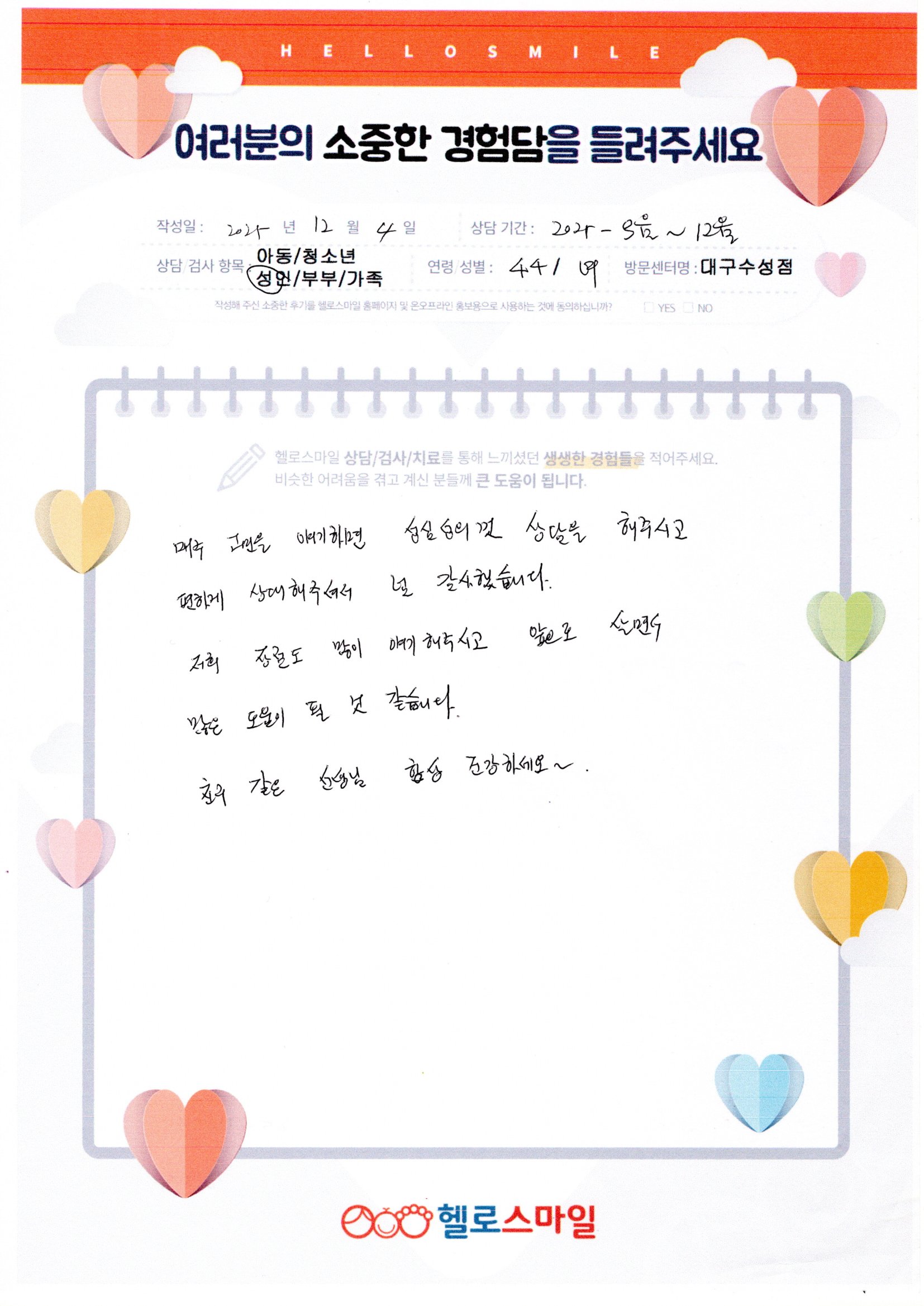 작성일 : 2025. 12. 04연령 : 44세성별: 여매주 고민을 얘기하면 성심 성의껏 상담을 해주시고 편하게 상대해 주셔서 늘 감사했습니다. 저의 장점도 많이 얘기해 주시고 앞으로 살면서 많은 도움이 될 것 같습니다.친구 같은 선생님 항상 건강하세요~ 대구심리상담센터 수성점 문의 및 예약카카오톡 : hellosmiledg대표전화 : 053-755-5412~3